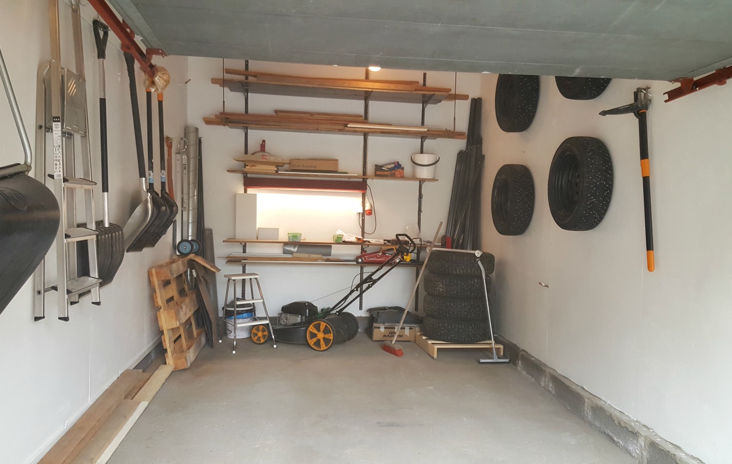 Tavaroiden suhteen ei tehty suuria uudelleen järjestelyjä. Takaseinällä säilytettiin vanhat hyllyt (tosin kovan kuurauksen läpikäyneinä)ja seinille kiinnitetiin koukkuja, jotta saatiin minimoitua lattialla kuljeksivat tavarat. Loppusuoralla tila näytti jo ihan inhimilliseltä: